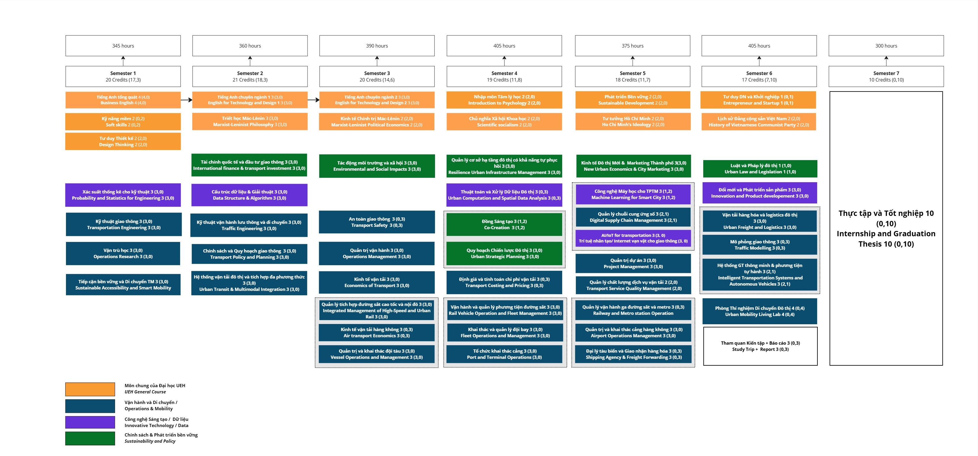 - Kiến thức liên ngành vững chắc: Kết hợp chặt chẽ kinh tế, quản lý và công nghệ tiên tiến, trang bị cho sinh viên khả năng quản trị, khai thác và tối ưu hóa hệ thống vận tải đa phương thức (đường bộ, đường sắt, hàng hải, hàng không) trong môi trường đô thị thông minh và phát triển bền vững. Tham gia chương trình, sinh viên có cơ hội được học tập trao đổi nước ngoài và nhận song bằng.